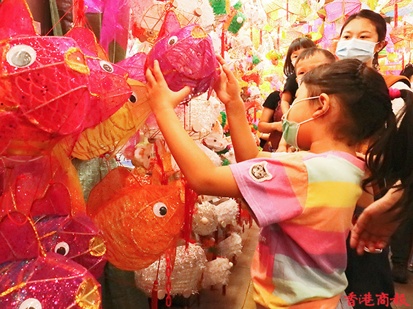 這裏的燈籠造型精緻,放在一起形成壯觀畫面,猶如置身古代的花燈會,除了區內市民外,也吸引不少外區人士慕名前來打卡、購買,雖然是戴着口罩,但大人小童的歡笑驚嘆聲依然此起彼落。(記者馮瀚文 攝)