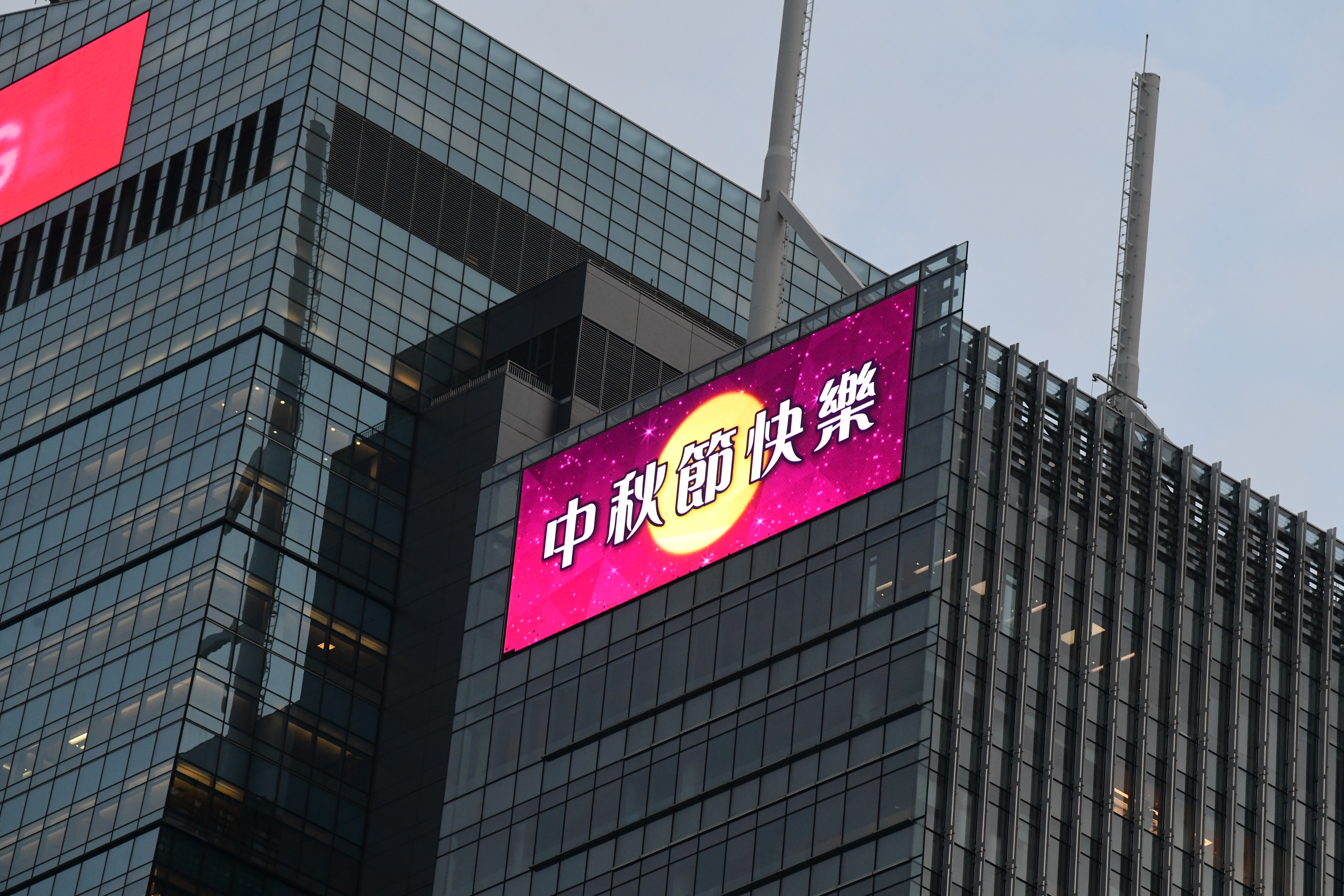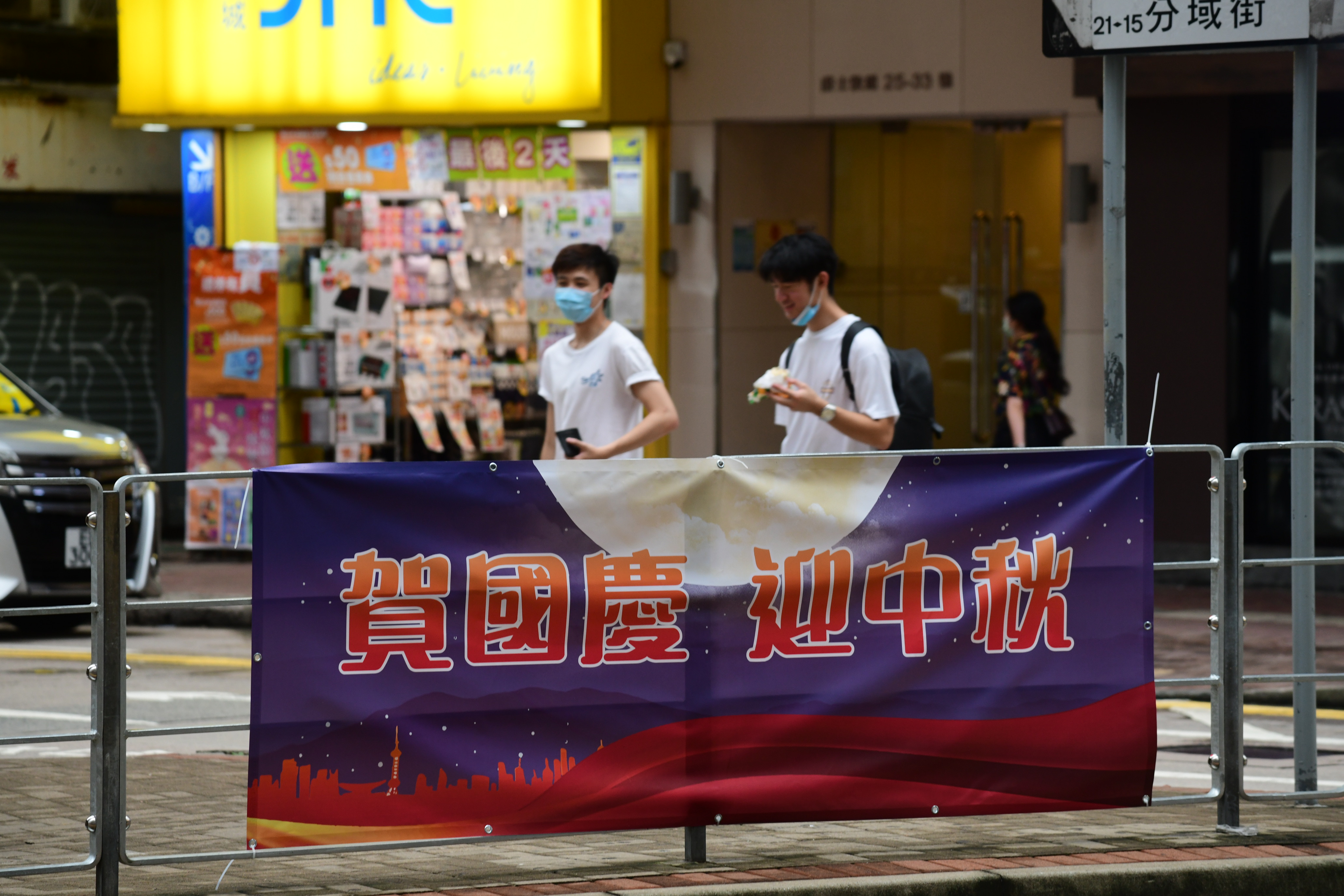國慶節和中秋節将至,今日(30号)本港大街小巷即已装点上各式横幅,营造出浓浓的节日气氛。(摄影 崔俊良 郑玉君 罗璇)