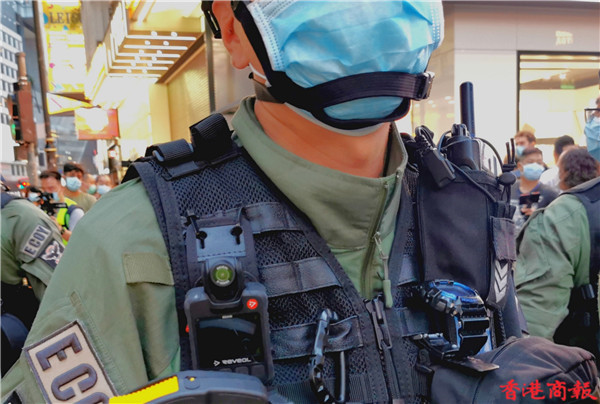 為減少外間對警方現場執法的質疑,前綫警員近日開始增置隨身記錄設備,昨日在銅鑼灣示威現場,所有的警員都配備了隨身攝錄機,首次實現全員「一人一機」。