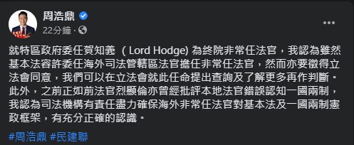 行政長官林鄭月娥今日(5日)接納司法人員推薦委員會推薦,根據《基本法》第88條任命英國最高法院副院長賀知義,出任終審法院其他普通法適用地區非常任法官。民建聯立法會議員周浩鼎晚上於社交平台發貼文回應任命。