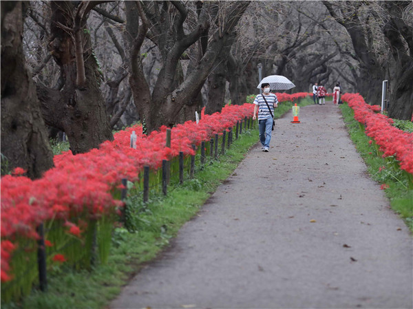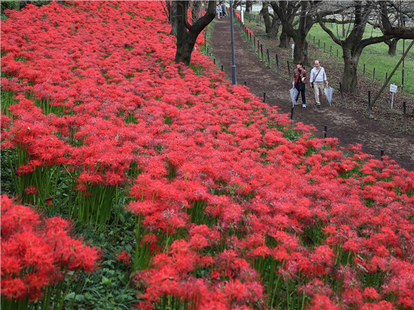 10月7日,遊人在日本埼玉縣幸手市欣賞權現堂公園內的曼珠沙華。