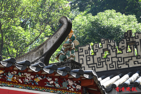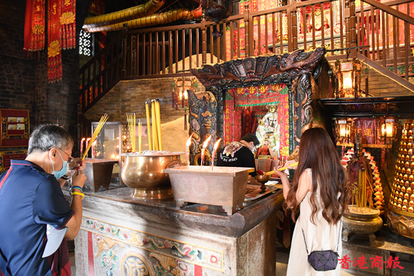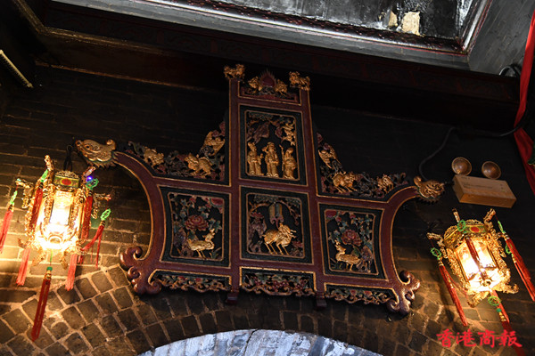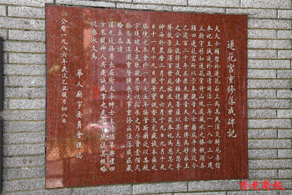 蓮花宮是兩進式建築,但兩進之間不設天井,前殿建築呈半八角形寶塔狀,設重檐攢尖屋頂,正面的小陽台設有西洋風格的欄杆。廟門設於左右兩側,與其他廟宇在中央設置廟門不同。主殿後部的建築為長方形,蓮花石亦位於此處,廟殿依蓮花石建,分成上下兩層,下層設石制神壇供奉觀音,上層設有太歲殿及木製觀音神樓,兩個樓層之間的平台則有韋馱殿。廟殿有立於道光與同治年間,雕工細緻的花崗石供枱(1864)、古鐘(1865)與石神壇(1885),及宣統年間的彩門(1909)。天花為六邊形,上有金龍與祥雲,前者神態活靈活現,似是呼應每年中秋期間舉辦的大坑舞火龍。而廟頂瓦脊則飾有象徵吉祥的寶珠、鰲魚及獅子等。(记者蔡啟文攝)