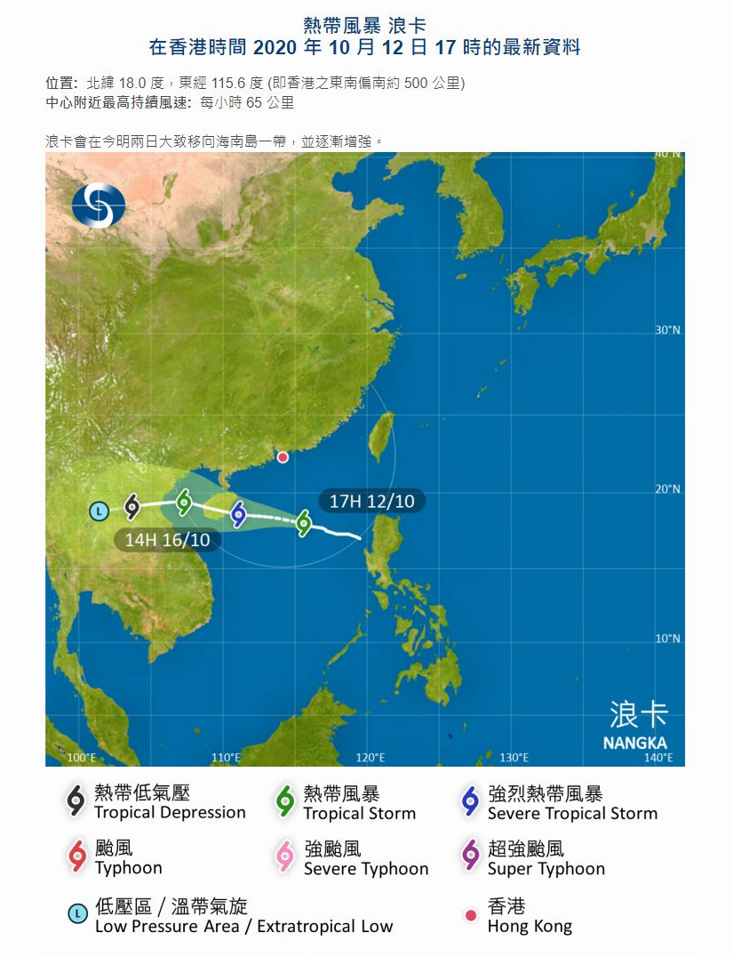 天文台表示,在12日下午5時,「浪卡」集結在香港之東南偏南約500公里,即在北緯18.0度,東經115.6度附近,預料向西或西北偏西移動,時速約22公里,大致移向海南島一帶,並逐漸增強。