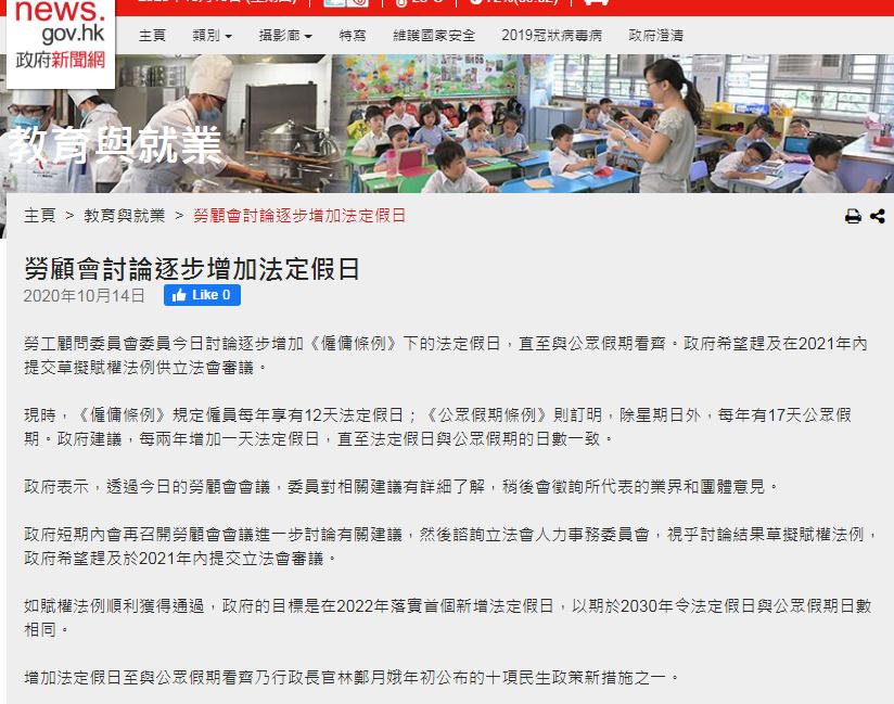 政府建議增加法定假日(俗稱勞工假)至17日,與公眾假期看齊,勞顧會10月14日討論有關建議。