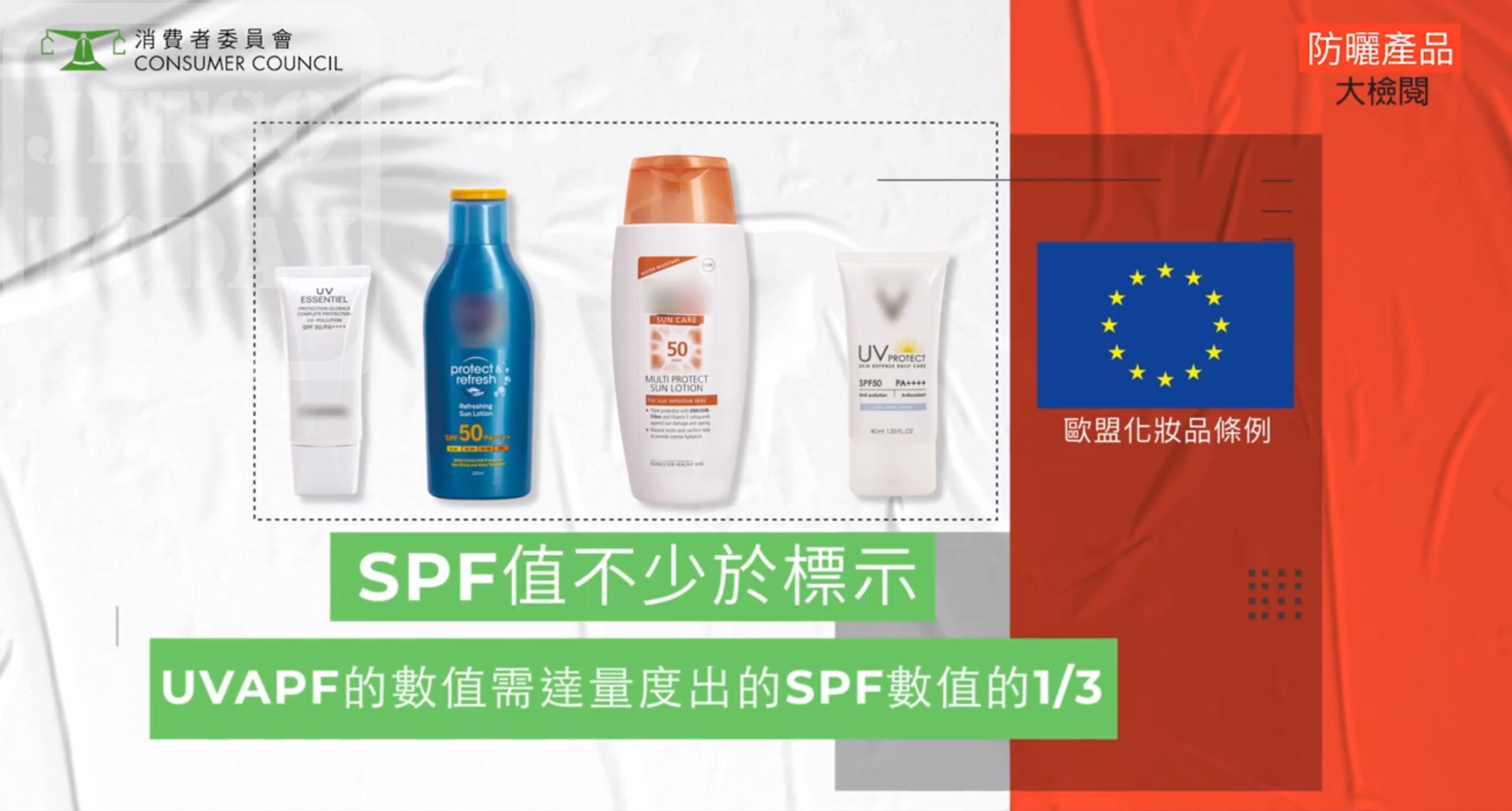 消委會說,SPF測試中,有14款樣本標示為SPF30至50、屬於高度保護的防曬產品。當中8款樣本量得的SPF值低於產品標示值,有一款SPF30的樣本差異最大,量得的SPF值僅為9.8。而16款標示為SPF50+、即極高度保護防曬產品中,只有一款完全符合歐盟要求;14款樣本量得的SPF值為60以下。SPF值最低的兩款樣本,更只量得11.7及14.3。