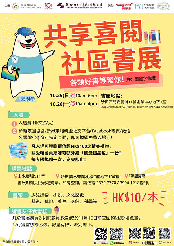 由慈善機構新家園協會主辦的「共享喜閱社區書展」將於10月25日起一連兩日在沙田石門舉行,屆時將以每本10元優惠價出售1.3萬本全新書籍,所有收益扣除成本後,將全數撥捐新家園協會作慈善用途。書展開放予公眾參與,希望推動閱讀文化,鼓勵市民善用居家抗疫時光,發掘閱讀樂趣。