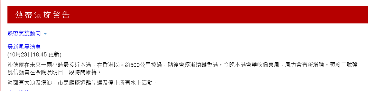 昨日是二十四節氣的「霜降」,但仍有颱風趨近本港。天文台在昨日(23日)凌晨零時許發出3號強風信號,颱風「沙德爾」集結在香港以南約500公里,並在昨晚最接近本港,天文台表示改掛8號烈風或暴風信號機會不大。
