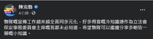 圖為警方在社交平台普及冷知識,民建聯立法會議員陳克勤讚揚越來越全面同多元化。