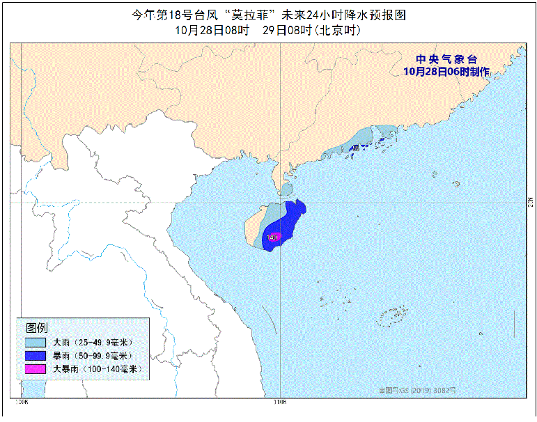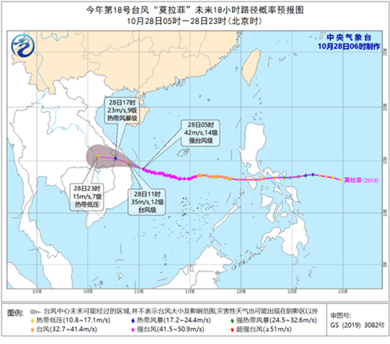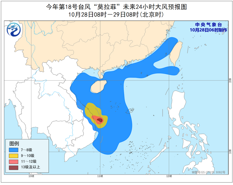 中央氣象台10月28日6時繼續發布颱風藍色預警:今年第18號颱風「莫拉菲」(強颱風級)的中心28日早晨5點鐘位於越南廣義省東偏南約205公里的南海中西部海面上,就是北緯14.2度、東經110.4度,中心附近最大風力有14級(42米/秒),中心最低氣壓為955百帕,七級風圈半徑350-500公里,十級風圈半徑100-150公里,十二級風圈半徑70-80公里。