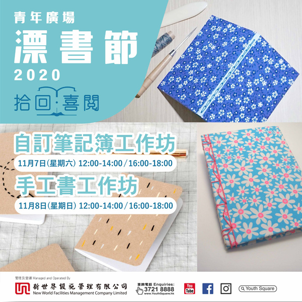 青年廣場指,因應新冠肺炎疫情,「漂書節」的活動需要公眾進行網上預約。而「漂書節 2020」會在11月7日及8日設有手作工作坊,包括由青年手作家陳寶婷主理的「自訂筆記簿工作坊」會教授參加者如何使用簡單的工具製作筆記簿;而《蛋誌》創辦人黃天盈會教授「手工書工作坊」,藉以推廣手工書及分享製作手工書的樂趣。
