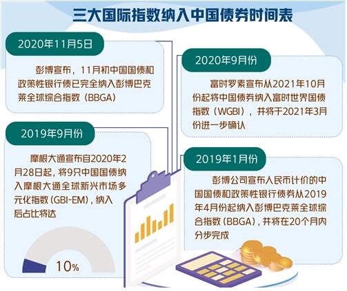 2019年1月31日,彭博公司宣布人民幣計價的中國國債和政策性銀行債券從2019年4月份起納入BBGA。摩根大通緊隨其後,於2019年9月份宣布從2020年2月28日起,將9只中國國債納入GBI-EM,納入後中國國債佔比將達10%,已經達到國別佔比上限。這一過程將分10個月完成。市場估算,完全納入GBI-EM可带來200億美元資金流入。2020年9月25日,富時羅素宣布從2021年10月份起將中國債券納入WGBI,並將於2021年3月份進一步確認。