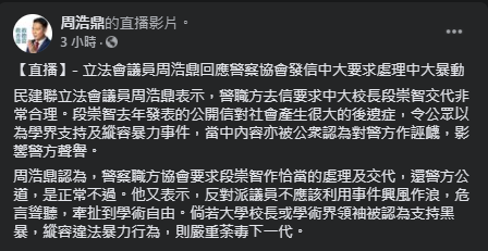民建聯立法會議員周浩鼎認為,警司協會、香港警務督察協會、海外督察協會及警察隊員佐級協會今日(6日)去信要求中大校長段崇智澄清公開信的做法非常合理。周浩鼎指段崇智去年發表的公開信令公眾以為學界支持及縱容暴力事件,當中內容亦會影響警方聲譽。