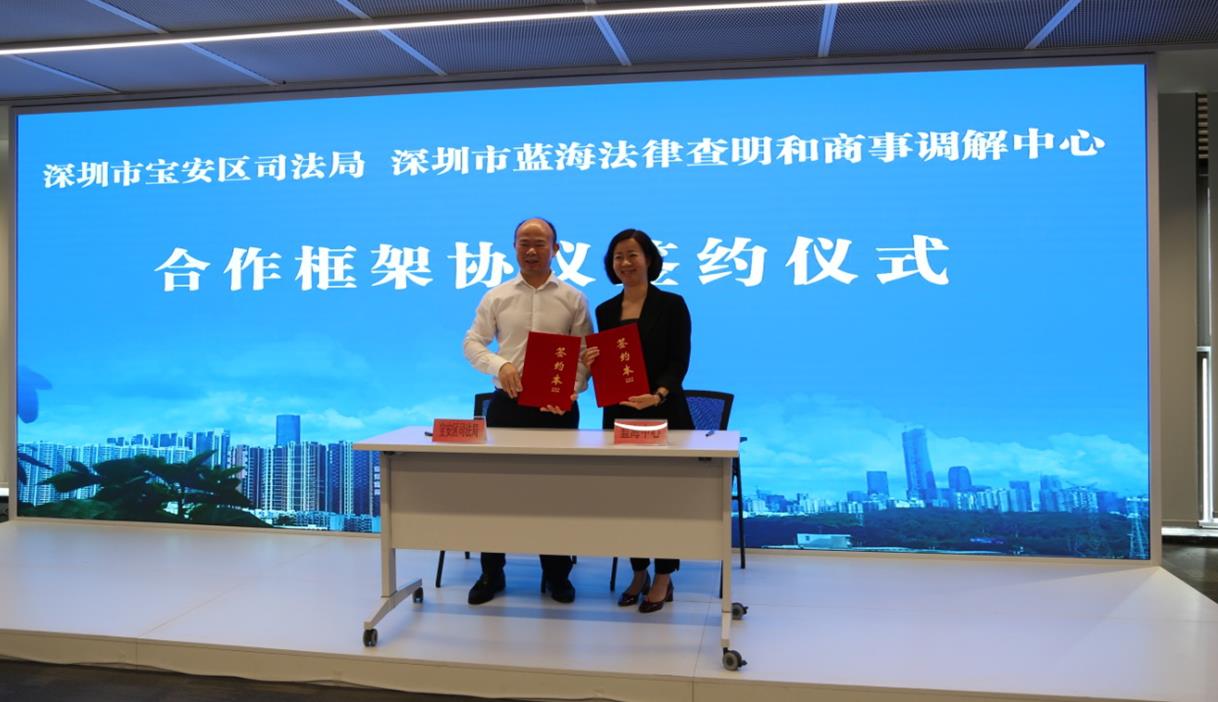 為此,寶安區司法局舉行「深圳市寶安區公共法律服務中心會展法律服務工作點揭牌儀式」,並攜手深圳市藍海法律查明和商事調解中心(以下簡稱「藍海中心」),共同簽署《深圳市寶安區司法局與深圳市藍海法律查明和商事調解中心合作框架協議》,旨在為企業「走出去」提供法治保障。