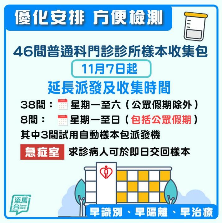 本港新冠肺炎疫情持續,為更方便市民,由今日(7日)起,醫管局46間普通科門診延長派發及收集樣本瓶至周六,部分門診於周日亦會派發樣本瓶。