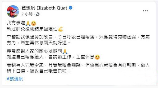 葛珮帆今日中午在社交媒體發文指,「我冇事啦」,表示自己的檢測結果呈陰性,又引述中醫指她是過勞加感冒,「今日呼吸已經唔痛,只係覺得有啲虛弱,冇氣冇力,希望再休息兩天就好返。」