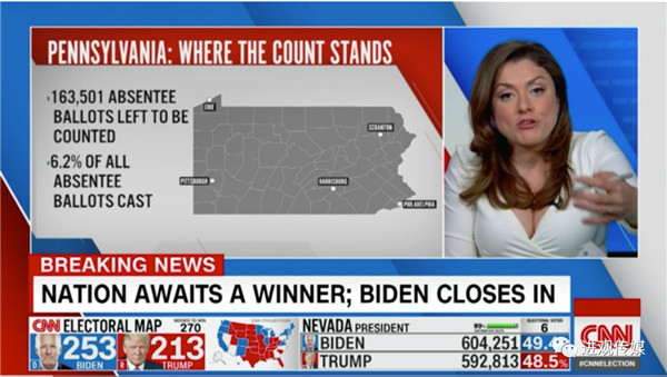據路透社今天上午11點發出的報道,在全國已經統計的1.47億張選票中,拜登比特朗普多410萬張。但在四個「戰場州」(battleground states),他在1600萬的總選票中只比對手多83038張票。在佐治亞州,他只領先3962張票。這個比分是相當接近而充滿危險的。但在賓州,拜登與對手的領先差距正在擴大。《紐約時報》則報道他在內華達州領先的票數一日內增加了一倍,達2.26萬張。