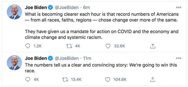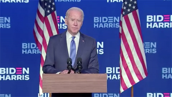 他一開始便說,「我不是來宣布最後的勝選的,但數據清晰地表明,我們將贏得這場競賽。」他強調說他已經獲得了7400萬張選票,超過歷史上任何一屆總統候選人。在約10分鐘的演講中,他呼籲民眾再保持點耐心,說「雖然我們都在等最後的結果,但我們的工作已經開始,不會再等待」。