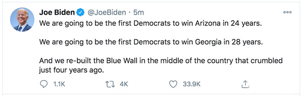 昨晚,佐治亞州、賓州已經翻藍,加上之前已被CNN等媒體打上藍勾的密歇根和威斯康星兩州,以及前天就被福克斯和美聯社寫入記分牌的亞利桑那州,還有目前拜登仍然領先的內華達州,拜登大概率會以290票以上的戰績拿下總統大位。即便因纏訟、重新計票等失去一、二個州,看來也不會影響最終選情。