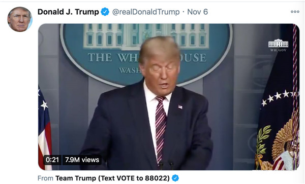 當前的選情令特朗普十分着急。北京時間今天上午7點半,他得知拜登將要發表講話,立即發推說:「拜登不得錯誤地宣布勝選。我也可以做這樣的演講,但司法程序才剛剛開始!」