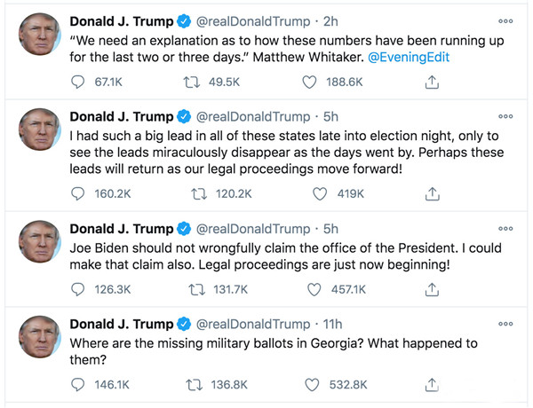 此前的24小時內,他發了數十條推特,內容包括:質問佐治亞州的軍隊選票去了哪裏;隨着極左民主黨人對共和黨參議員的攻擊,總統職位就顯得更加重要;費城是有着大選舞弊歷史的城市等。今天上午10點半時,他發推說:「我們需要一個解釋,最後這兩天的選票是怎樣被操弄的。」