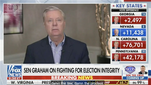 就在共和黨大佬們按兵不動激怒特朗普家人和私人律師朱利亞尼出來抨擊後(詳見昨日文章:特朗普孤軍奮戰 共和黨袖手旁觀),共和黨一些頭面人物出來表態了。據多個新聞來源,最先發聲的是曾經參選2016年黨內總統候選人的共和黨眾議員格雷厄姆。他昨天上午在接受福克斯電視台採訪時說:「民主取決於公平的選舉。特朗普總統的團隊將有機會就投票違規行為進行申辯,我會站在特朗普總統一邊。……我不會被媒體的威嚇阻止。」