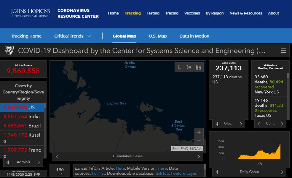 美國約翰霍普金斯大學最新統計顯示,截至香港時間8日下午2時25分,全球確診感染新型冠狀病毒人數增至超過4983萬,有超過125萬人死亡。在疫情最嚴重的美國,超過986萬人確診,23.7萬人死亡。報道指,預料當選總統的拜登會在星期一,成立一個有12名成員的疫情專責小組。