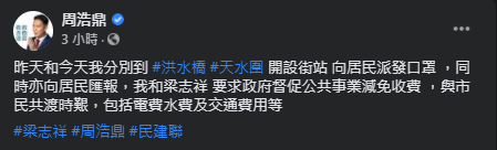 民建聯立法會議員周浩鼎在社交平台表示,他在昨日(7日)和今日(8日)於洪水橋和天水圍設街站,向居民派口罩與匯報工作內容。