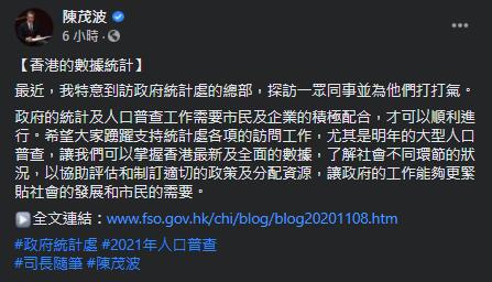 陳茂波在網誌提到,統計處的重點項目是每10年一度的大型人口普查,這是需要市民充分配合才能進行。陳茂波指確保統計數字適時更新,對政府的政策制定非常重要。