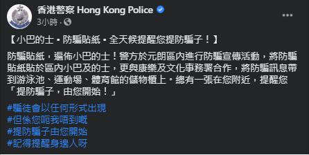 警方在社交平台表示,他們在元朗區進行防騙宣傳活動,在區內的小巴及的士張貼防騙貼紙,以提醒市民「提防騙子,由您開始!」(圖片來源:香港警方 Hong Kong Police 臉書(Facebook)專頁。)