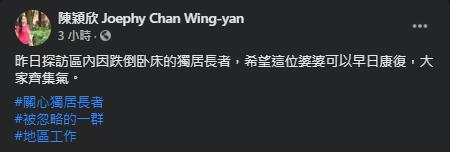 前區議員陳穎欣在社交平台表示,她於昨日(7日)探訪區內一名因跌倒臥床的獨居長者,而陳穎欣亦在貼文指希望婆婆早日康復。(圖片來源:前區議員陳穎欣 Joephy Chan Wing Yan 臉書(Facebook)專頁。)