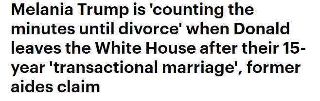 報道指,特朗普的前助理紐曼表示,特朗普的妻子梅拉尼婭正計算着特朗普離職時刻的到來,並可能會和他離婚。梅拉尼婭的前助手兼朋友沃爾科夫透露,他們15年的婚姻就是一筆交易,這對夫妻在白宮其實是分房睡的。
