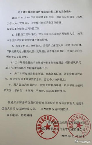 11月9日,網傳上海浦東區祝橋鎮營前村發現一例疑似新冠病毒(機場工作人員,安徽籍),現在已採取緊急措施。據傳,目前營前村已封村進行核酸檢測,佛羅倫薩小鎮涉及商家已經封鎖。