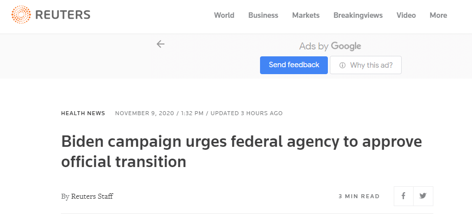 據報道,美國總務署一位女發言人表示,美國總務署署長艾米莉·墨菲(Emily Murphy)還沒有確定「誰是最後的贏家」。這推遲了拜登團隊的交接事項,例如獲得數百萬美元的聯邦資金,以及與情報機構和其他部門官員會面等。