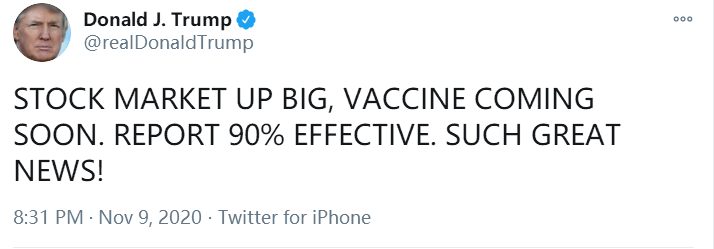 香港時間9日晚間,特朗普在推特上用英文大寫字母發文,宣布一個「好消息」。他寫道:「股市大漲,疫苗即將上市。報告90%有效。好消息!」