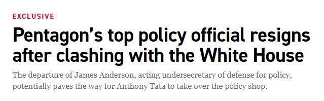 報道稱,據現任國防部官員和一位前國防部官員稱,安德森在與白宮人事辦公室(官員)發生衝突後辭職,他於當地時間11日早上提交了辭職信。
