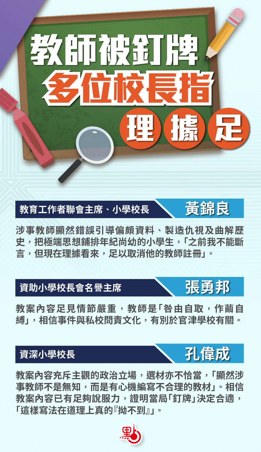 資深小學校長孔偉成坦言,教案內容充斥主觀的政治立場,選材亦不恰當,「顯然涉事教師不是無知,而是有心機編寫不合理的教材」。他相信教案內容已有足夠說服力,證明當局「釘牌」決定合適,「這樣寫法在道理上真的『拗不到』」。