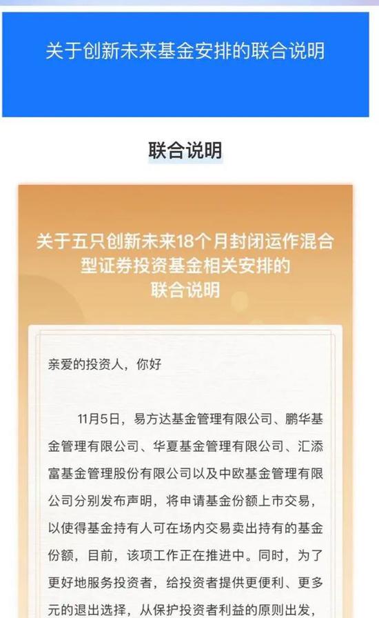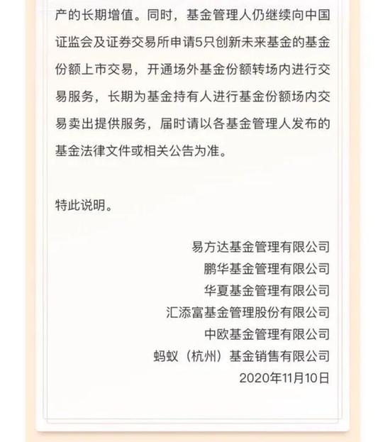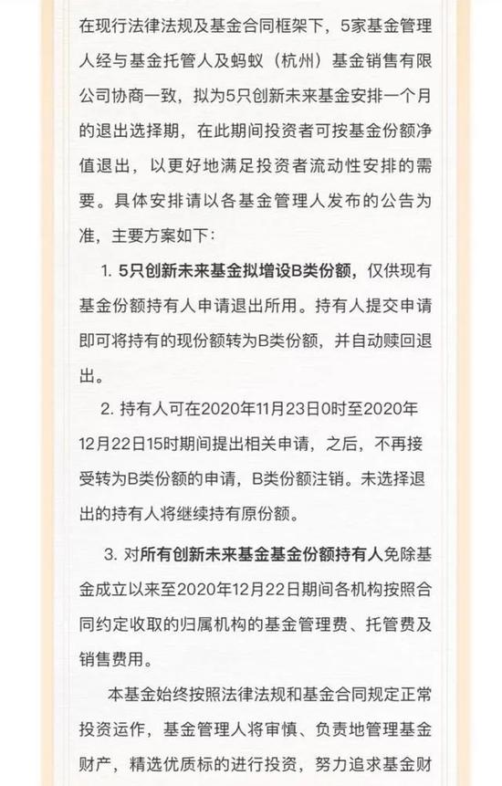 據支付寶財富號發布公告稱,5家基金管理人經與托管人及螞蟻(杭州)基金銷售有限公司協商一致,擬為5隻創新未來基金安排一個月的退出選擇期,在此期間投資者可按基金份額淨值退出,以更好地滿足投資者流動性安排的需要。