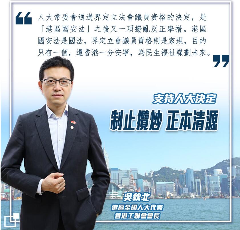 港區全國人大代表、工聯會會長吳秋北表示,支持人大的決定,樂見特區政府當機立斷,還立法會一份尊嚴,為香港政治生態去毒除害。