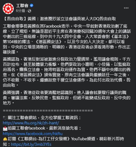 全国政协委员、工聯會理事長黃國今日(11日)在社交平台表示,中央一早對香港政治劃了底線、立了規矩。今次的人大決定可以看到中央的立場是清晰、明確的,香港從政者必須看清形勢,作出正確抉擇。