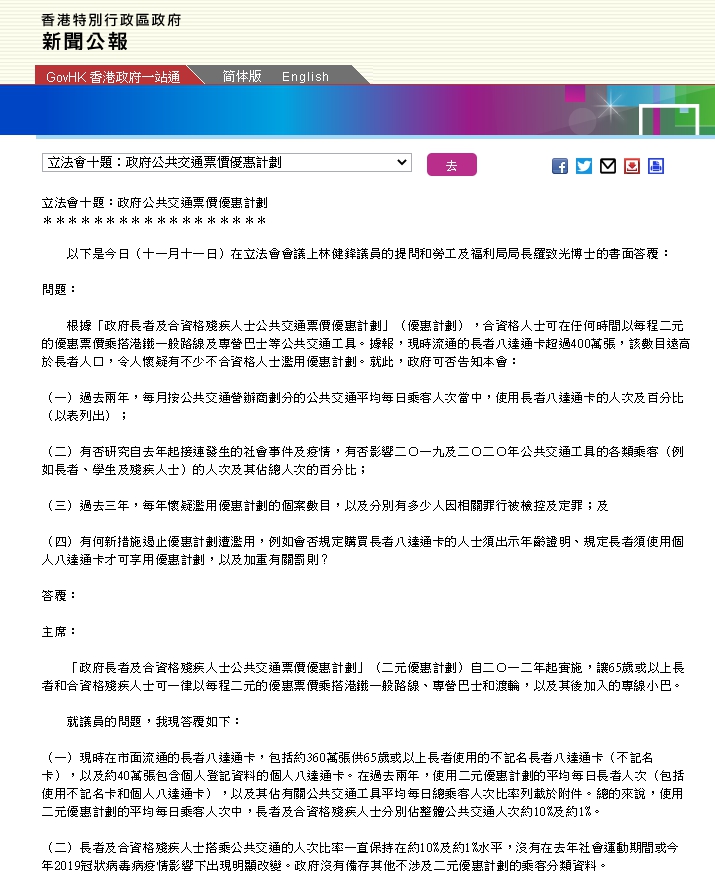 勞福局指出,現時在市面流通的長者八達通卡,包括約360萬張供65歲或以上長者使用的不記名長者八達通卡(不記名卡),以約40萬張包含個人登記資料的個人八達通卡。在過去兩年,使用2元優惠計劃的平均每日長者人次(包括使用不記名卡和個人八達通卡),佔整體公共交通人次約一成。政府正全面檢討2元優惠計劃,包括就防止濫用措施的成效深入研究探討。
