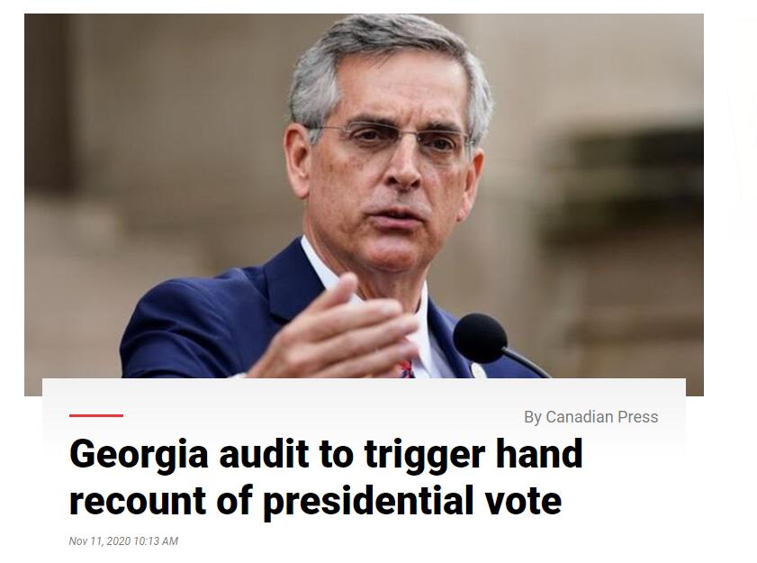 據美媒剛剛消息,佐治亞州州務卿Brad Raffensperger表示該州將手工重新計算總統選舉的選票,11月20號前爭取統計完成。目前拜登在佐治亞州領先特朗普14111票。