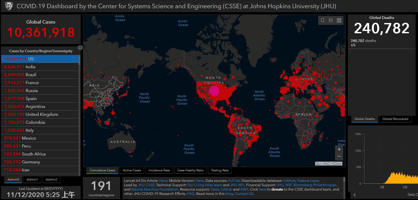 據美國約翰斯·霍普金斯大學統計數據顯示,截至香港時間12日5時30分左右,美國累計新冠肺炎確診病例超1036萬例,達到10361918例;死亡病例超24萬例,達到240782例。過去24小時,美國新增確診148397例,新增死亡病例1414例。