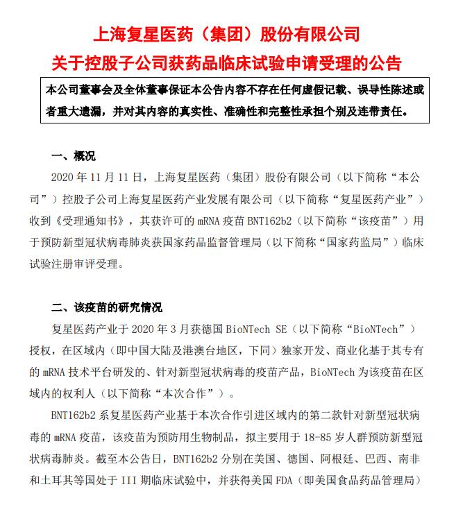 據上海復星醫藥(集團)股份有限公司(以下簡稱「復星醫藥集團」)11月12日發布的公告顯示,其控股子公司上海復星醫藥產業發展有限公司(以下簡稱「復星醫藥產業」)收到《受理通知書》,其獲許可的 mRNA 疫苗 BNT162b2(以下簡稱「該疫苗」)用於預防新型冠狀病毒肺炎獲國家藥品監督管理局(以下簡稱「國家藥監局」)臨床試驗註冊審評受理。