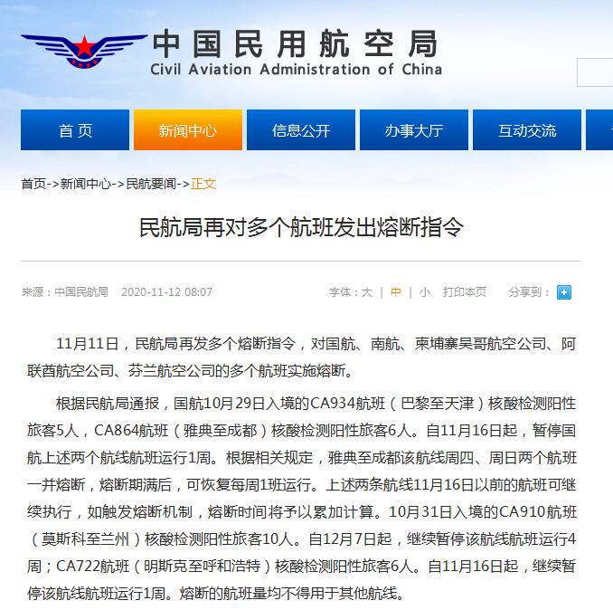 根據民航局通報,國航10月29日入境的CA934航班(巴黎至天津)核酸檢測陽性旅客5人,CA864航班(雅典至成都)核酸檢測陽性旅客6人。自11月16日起,暫停國航上述兩個航線航班運行1周。根據相關規定,雅典至成都該航線周四、周日兩個航班一併熔斷,熔斷期滿後,可恢復每周1班運行。上述兩條航線11月16日以前的航班可繼續執行,如觸發熔斷機制,熔斷時間將予以累加計算。10月31日入境的CA910航班(莫斯科至蘭州)核酸檢測陽性旅客10人。自12月7日起,繼續暫停該航線航班運行4周;CA722航班(明斯克至呼和浩特)核酸檢測陽性旅客6人。自11月16日起,繼續暫停該航線航班運行1周。熔斷的航班量均不得用於其他航線。