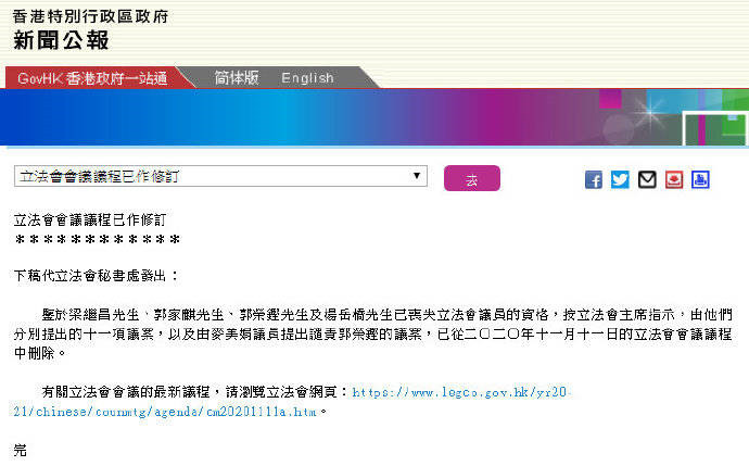 另一方面,立法會秘書處昨表示,由於郭榮鏗、楊岳橋、郭家麒、梁繼昌4人已失去議席,按立法會主席的指示,由他們分別提出的11項議案,以及由工聯會議員麥美娟提出譴責郭榮鏗的議案,都已從立法會會議議程中刪除。直至傍晚,秘書處回覆傳媒時表示,已收到了15名立法會議員的辭職信。當中,民主黨議員許智的辭職於昨日生效;議會陣線議員毛孟靜的辭職會於今日生效;至於餘下13名議員的辭職,則將在12月1日生效。