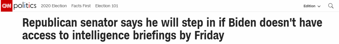 情報委員會最高民主党參議員馬克·沃納(Mark Warner)也呼籲拜登接受簡報,並表示,在這種不確定的時期內,拒絕這樣做是完全不負責任的。