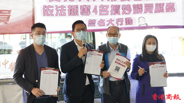 新界各界大聯盟代表陳勇表示,4人行為如在抗日戰爭便是「漢奸」,如在美國發生便是「美奸」,大聯盟全力支持人大決定,亦收到不少市民表達支持,故大聯盟發起街站於新界各區收集簽名,呼籲全港市民以簽名守護香港,支持香港核心價值從回正軌,如果任何人的行為危害國家安全,必須負上法律責任。