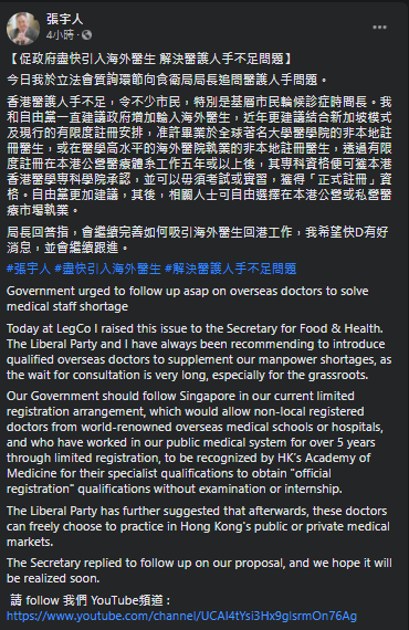 立法會飲食界議員張宇人在社交平台表示,他在今日(12日)的立法會會議上向食物及衛生局局長陳肇始追問醫護人手問題。