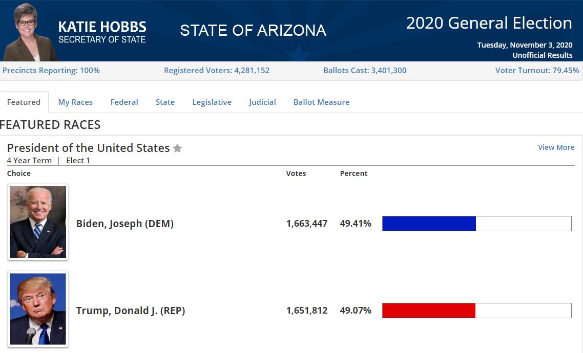 美國亞利桑那州務卿官網最新統計數據顯示,拜登已正式贏下亞利桑那州。該州目前已完成選票統計工作,最終拜登以49.41%的支持率擊敗特朗普,領先0.34個百分點。