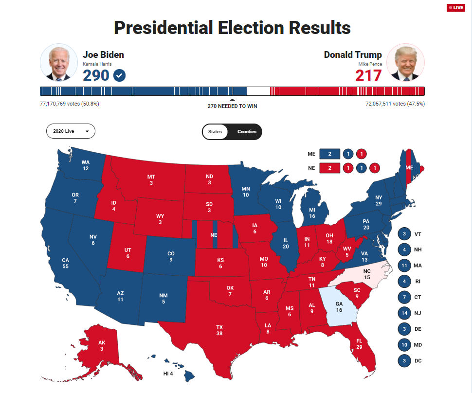 另據霍士新聞統計數據,拜登目前已經獲得了290張選舉人票。
